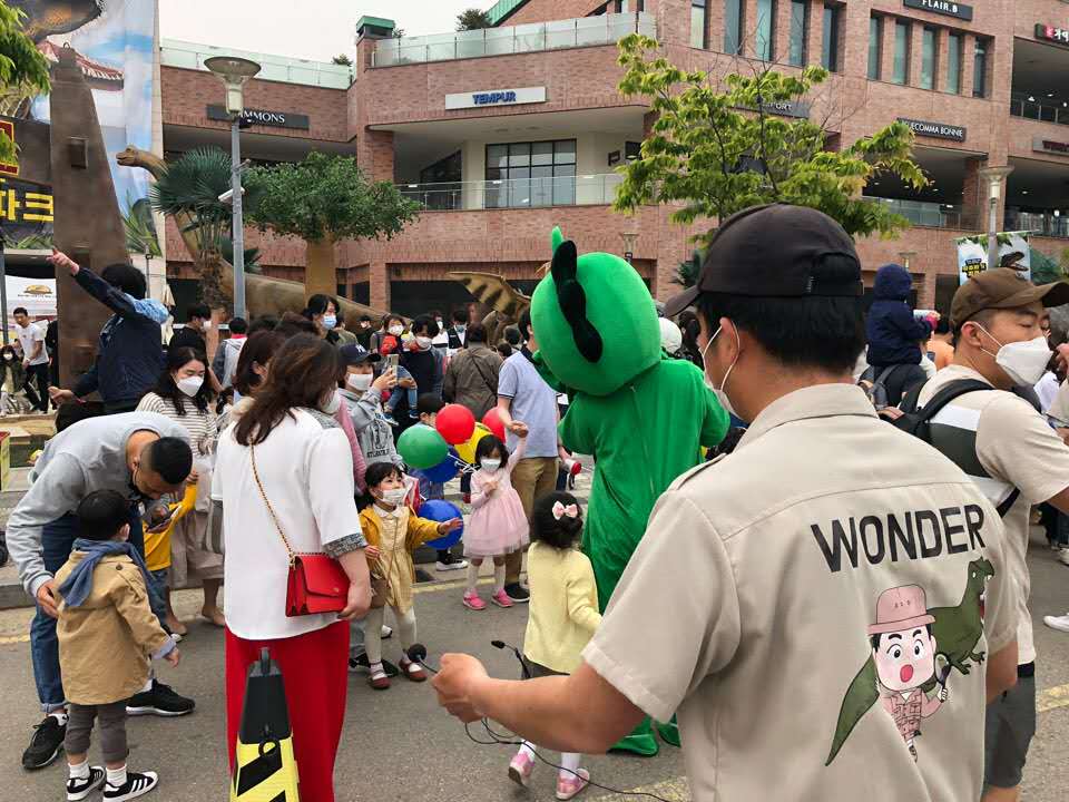 韓國樂天百貨反饋,剛安裝好的恐龍吸引了大量的游客駐足觀看拍照