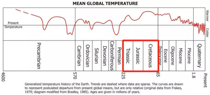 但很遺憾,恐龍所生活的三疊紀、侏羅紀、白堊紀三個地質(zhì)時期幾乎是地球溫度最高的時期。