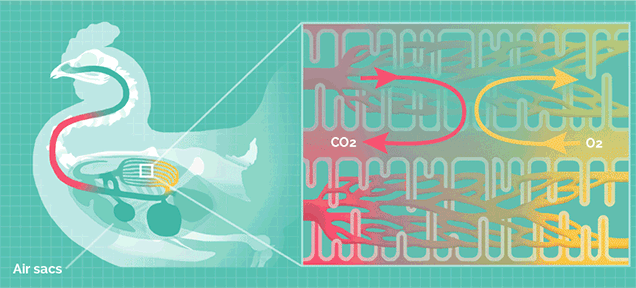 這種結構可以讓肺部實現(xiàn)無論吸氣還是呼氣都能攝取氧氣,稱為“雙重呼吸”,其效率是哺乳動物的2.5倍。