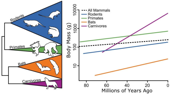 比如恐龍的體型不斷變大,而哺乳動物的體型也不斷變大,但更晚繁榮的哺乳動物不一定會比更早出現(xiàn)的恐龍大。