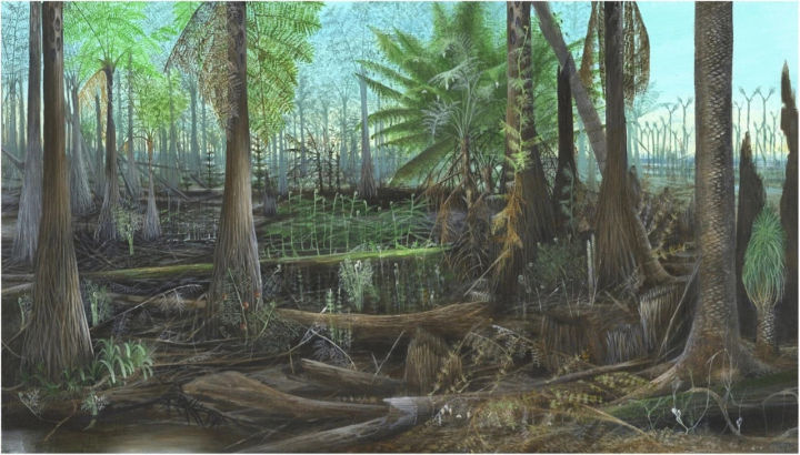 3億年前的地球,植物剛剛從海洋走上陸地,演化出了木質(zhì)化的維管組織,不僅能實現(xiàn)水分與營養(yǎng)物質(zhì)的運輸,也起到了一定的支持作用。