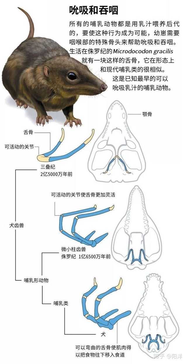 現(xiàn)代哺乳類的幼崽生下來都會本能地吸吮乳汁,但吸吮這個看似簡單的動作實現(xiàn)起來卻沒有那么簡單,哺乳類實現(xiàn)吸吮靠的是其特殊的舌骨結(jié)構(gòu),與爬行動物的簡單棒狀舌骨不同,現(xiàn)生哺乳類的舌骨構(gòu)造是由甲狀舌骨、基舌骨、角舌骨和上舌骨組成的一個鞍狀關(guān)節(jié)。無論是現(xiàn)存最原始的鴨嘴獸,或是早早分化出去的有袋類,還是包括人類在內(nèi)絕大部分哺乳類所屬的真獸都擁有這種舌骨關(guān)節(jié),所以它們的幼仔都能吸吮乳汁,“哺乳類”這個名稱也由此得名。