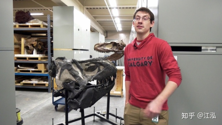 恐龍化石的發(fā)現(xiàn)還要追溯到十年前的2010年。約翰·德格魯特(John De Groot)是一位農(nóng)民兼古生物愛好者,一天他在和自己的家人沿著艾伯塔省南部的弓河(Bow River)河岸散步時,偶然發(fā)現(xiàn)了一些屬于大型肉食性恐龍的頭骨化石,于是他們趕緊聯(lián)系了皇家泰勒博物館(Royal Tyrrell Museum)。博物館很快就派來了專業(yè)人員對化石進行發(fā)掘?;瘹埡【哂泻苊黠@的暴龍科恐龍的特征,有可能是屬于一頭懼龍(Daspletosaurus ),因此標本也就沒有引起太多的關注,就先堆放到了倉庫之中。