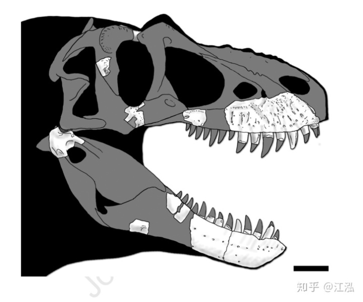 盡管頭骨不完整,但根據(jù)齒槽大致可以推斷出死掠龍上頜至少有14顆牙齒。這些牙齒非常粗壯,配合強壯的上下頜可以在獵物身上留下永久性的“記號”。正如同大部分的霸王龍類的化石上都有傷痕,死掠龍的頜骨上也留下一條大約4英寸長的傷疤,這應該就是它與同類或者其他掠食者搏斗所留下的印記。