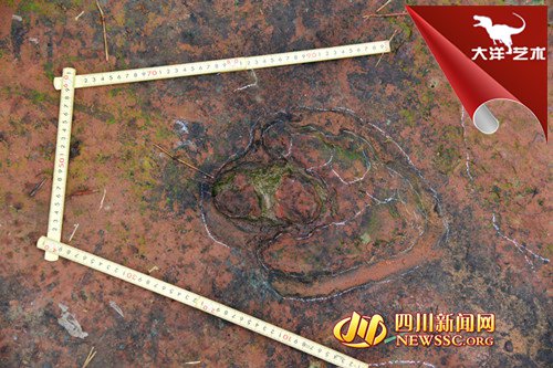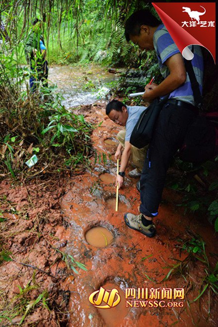 隨后,專家組對(duì)大石鄉(xiāng)新陽村桫欏溝恐龍足跡進(jìn)行考擦,龍井和新陽兩地相距直線距離約1500米。繼上次發(fā)現(xiàn)獸腳類恐龍的巖石上,再次發(fā)現(xiàn)蜥腳類恐龍?!斑@里保存著極好的獸腳類恐龍行跡?!鲍F腳類恐龍是一種兇猛的肉食性恐龍,是當(dāng)?shù)匕l(fā)現(xiàn)的蜥腳類足跡和鳥腳類足跡的造跡者的天敵。從足跡可推斷獸腳類恐龍長約4-6米。生活年代在白堊紀(jì)時(shí)期,距今約一億年。