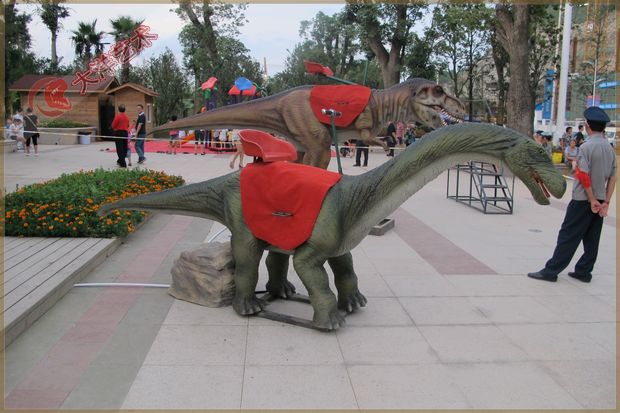 動 作:張嘴叫聲、頭左右、身前后,后退伸曲、前肢擺動、尾左右擺動。投幣后觀眾可騎坐隨龍搖動娛樂。