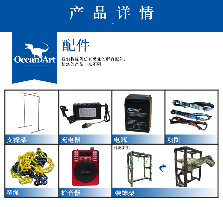 1.人控恐龍分為藏腿或露腿兩種設(shè)計(jì),服裝長(zhǎng)約4米,重20千克。藏腿恐龍服在腿和腹部處有一條拉鏈,當(dāng)操作者穿好后,拉上拉鏈便可完全遮住身影;露腿恐龍服則會(huì)把操作者雙腿露在外面。尾部有一條可抽出的長(zhǎng)桿,便于裝箱運(yùn)輸。另外,我們會(huì)提供一個(gè)支撐架,方便擺放恐龍服裝。